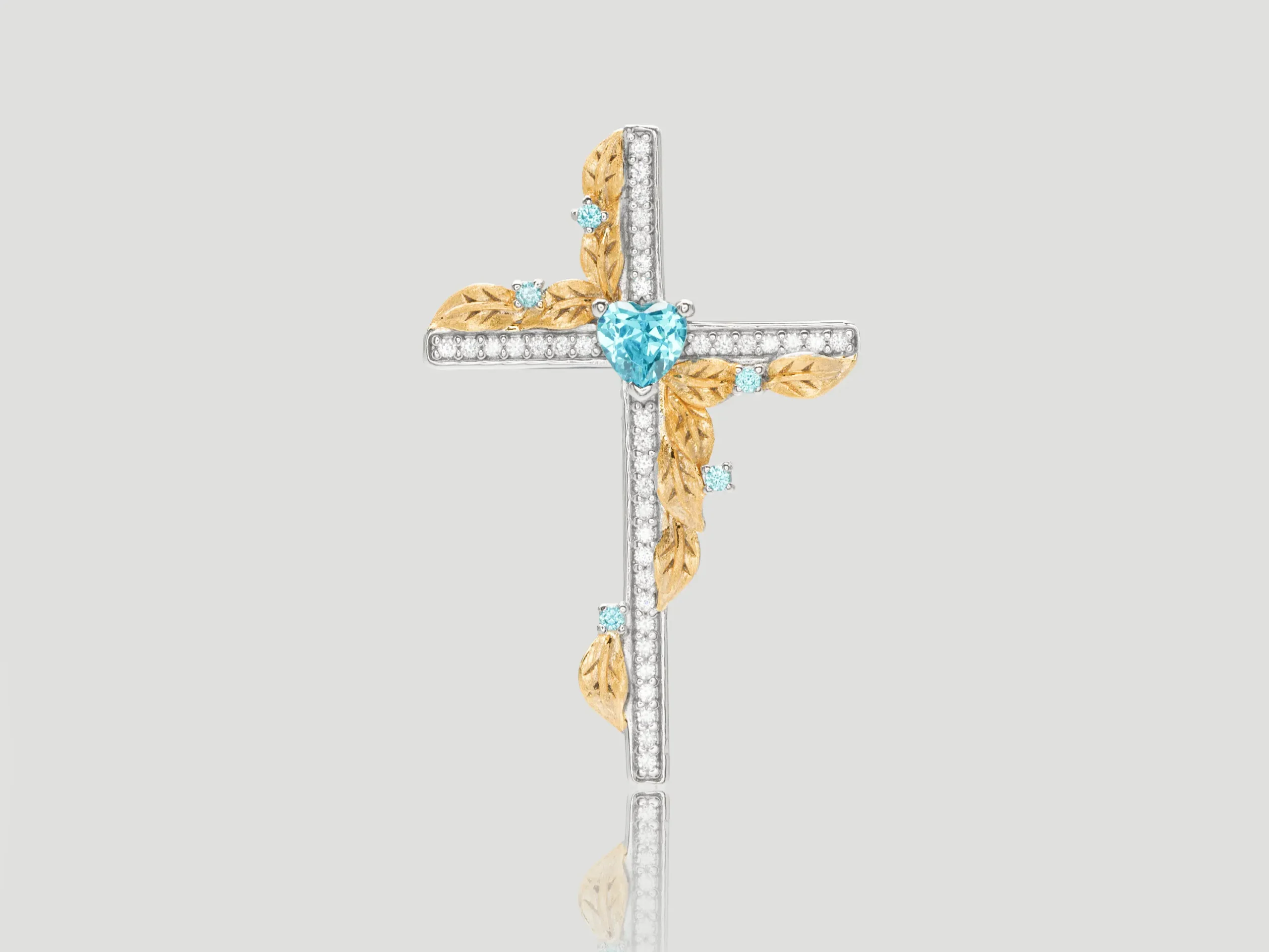 A dual-tone cross pendant features a shimmering heart-shaped blue topaz at its center, adorned with pavé-set clear diamonds along the arms and accented by gold leaf motifs with delicate blue sapphire accent.