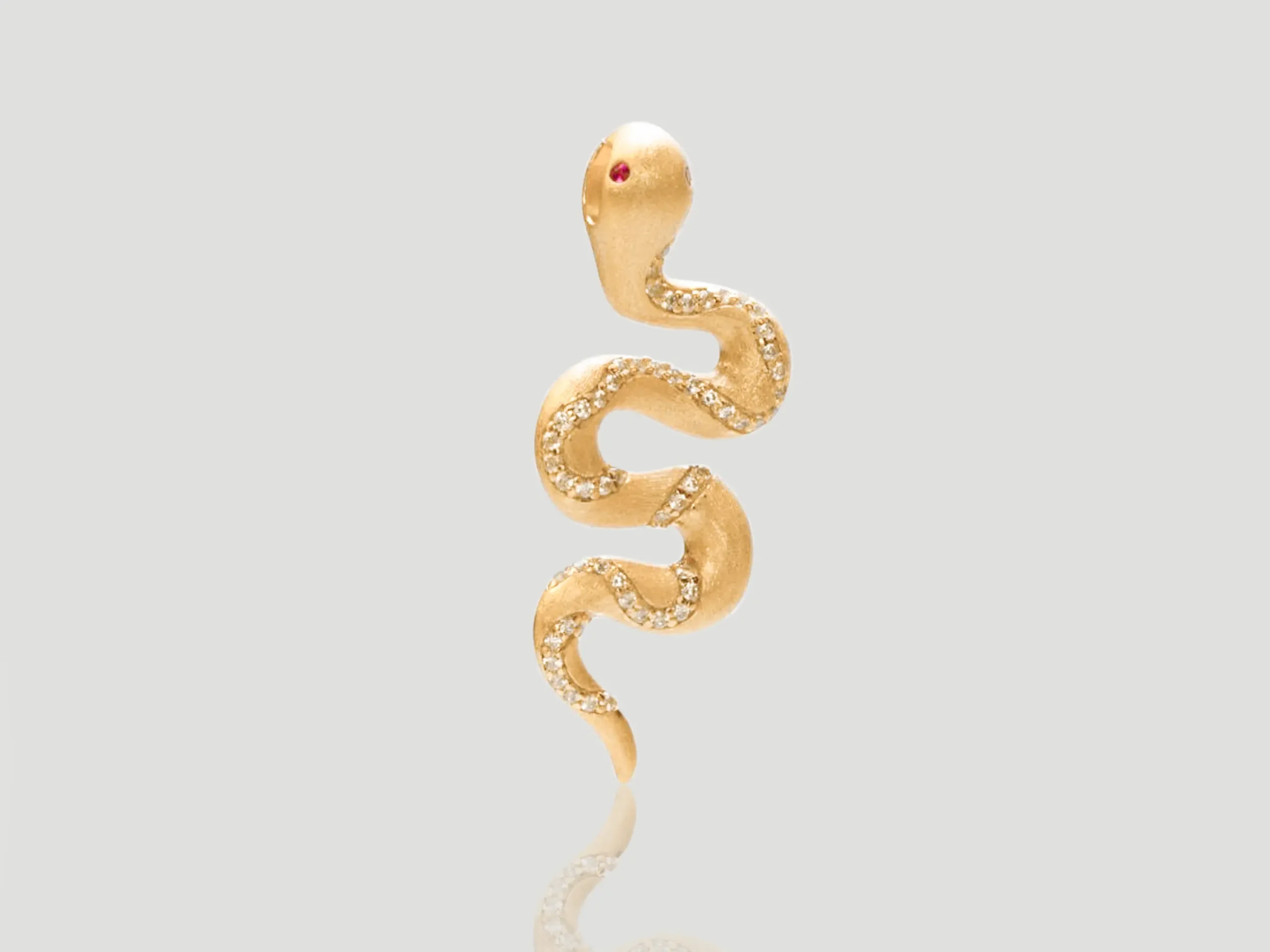 A pair of sinuous serpent pendants—one in radiant gold with a ruby eye and diamond-scaled coils, the other in gleaming silver with a garnet gaze and icy diamond accents—capturing the serpent’s mystique in dual metallic splendor.
